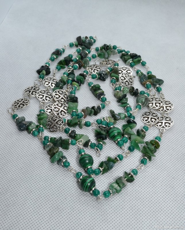Исходные данные - небольшая кучка малахитовой крошки. На выходе - длинные бусы на два оборота. Что делаем - думаем, пробуем, изобретаем очередной велосипед. Сажаем на пины крошку и добавляем мелкие плоские бусинки под металл. Еще добавляем круглых бусин двух видов. Соединяем 2 круглых металлических элемента в один и все собираем .