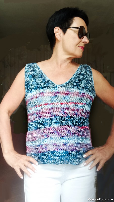 Связали топики из остатков пряжи, очень рыхлые. Связаны в две нитки, каждая меняется по цвету, есть секционка. В носке просто прелесть, мягкие, струящиеся, не жаркие. Ношу с удовольствием, в отличие от других своих работ, которые более эффектные, но менее удобные.