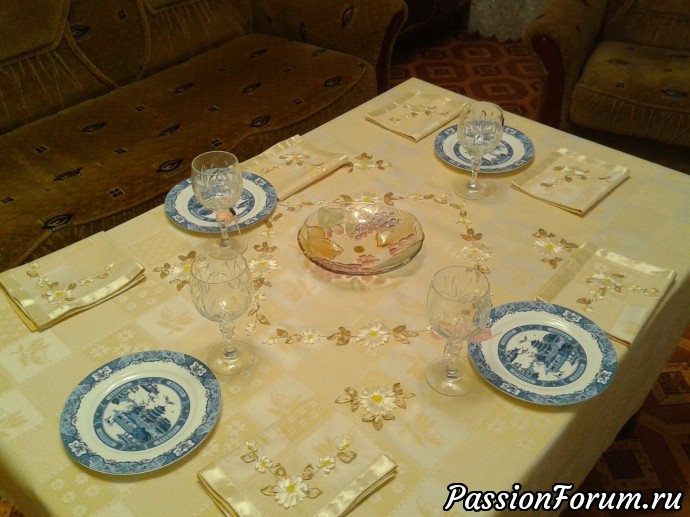 Первая проба вышить скатерть и салфетки к ней. Не все получилось так как хотелось бы, но и этим я осталась довольна. Ткань (лён) покупала, обшивала лентой, а потом вышивала. Трудновато было. Скатерть 180*160, салфетки 37*31.