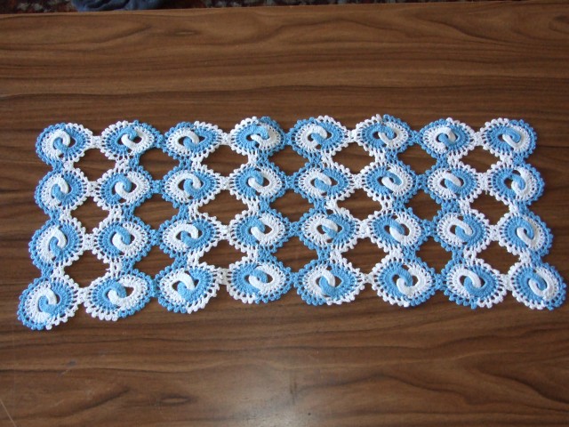 Продаю,а можно и на заказ в другом цвете.Дорожка связана из ниток №Ирис№ двух цветов)белый и голубой),состоит из 24 отдельных элементов.размер дорожки 56х23 см.Стоимость дорожки 700 руб.Получение только в Москве.Контакты см. профиль.