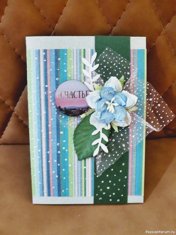 Суть совместного проекта в двух словах. Организатор проекта два раза в неделю сам делает открытку, определяет обязательный элемент (ОЭ). Участники должны сделать открытку на любую близкую ему тему с использованием ОЭ. Было еще два необязательных условия: использование обрезков/остатков бумаги от прошлых проектов и выполнение работы за 15 минут. Если с первым условием я справилась и слегка подсократила запасы бумаги, то уложиться в 15 минут, чтобы собрать готовый продукт не получилось ни разу. Хотя сюжет...