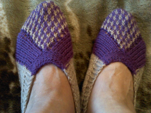 Связала тапочки из пуховой пряжи и украсила шерстяным цветочком . Тапочки очень теплые , ноги отгреваются в них , а то что то похолодало сильно .