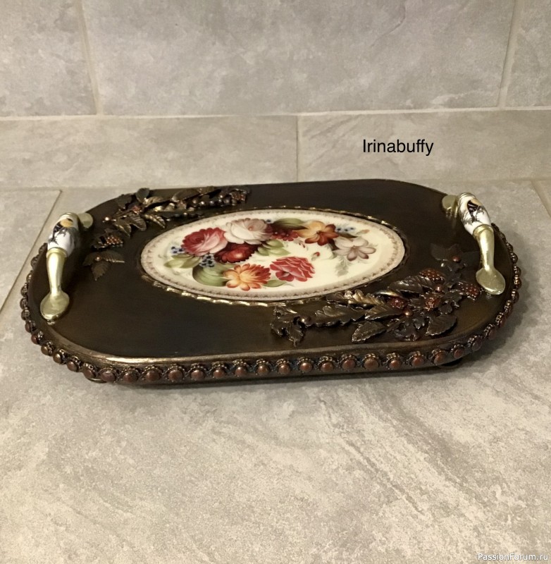 Приветствую всех жителей сайта!Хочу представить Вам мой подносик.Заготовка из дерева,но мне захотелось сделать имитацию металла с помощью окрашивания. Сделала обрамление картинки молдиком,залила ее эпоксидной смолой.Вылепила с помощью молдов и вручную 2 композиции из листьев и цветов,бортик украсила молодом.Крепила на Монтаж-Момент.После просушки красила различными красками: Бордо,лазурь,зелёный и все перекрывала местами бронзой.Получился сложный цвет с переливами.Далее немн...