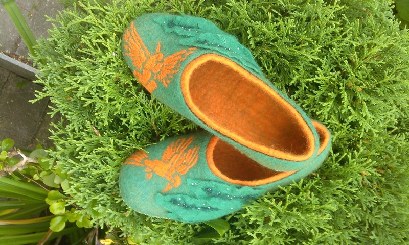 Новые тапочки сделала впервые с набивным декором по трафарету(художник никакой из меня, спасибо есть интернет и принтер) . Сваляны на стелечном шаблоне, двухслойные,без колодки. Использовался латвийский кардочёс. Листья вырезаны из префельта, сделанного из зелёной шерсти, приукрашены бисером.