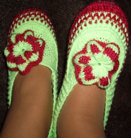 Подробное описание вязания Красивые тапочки крючком. Подробное описание вязания Предлагаем вам связать наступающим холодам вот такие миленькие домашние тапочки. Размер в готовом виде : указания даны для стопы длиной 8 дюймов [около 20,5 см] — размер 1. В круглых скобках ( ) приводятся данные для стопы длиной 9 и 10 дюймов [23 см и 25,5 см] — размеры 2 и 3. Материалы : основная пряжа темно-зеленого цвета, небольшое количес...