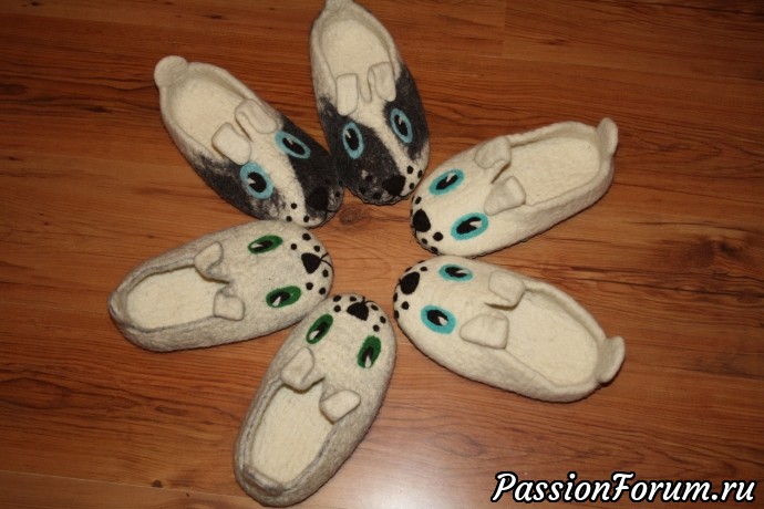 Сваляла тапки на подарки коллегам. По следам всем известного совместника. Огромное спасибо всем участникам данного мероприятия: организатору и идейному вдохновителю Зарине, а так же всем, кто предоставил мастер-классы, давал советы и наставления. Смотрела видео, читала комментарии, но всё равно не обошлось без косяков. Валяла собак, а получились зайцы. Поздравляю всех С Новым Годом! Всем здоровья, всех благ, творческих успехов! Спасибо, что заглянули.