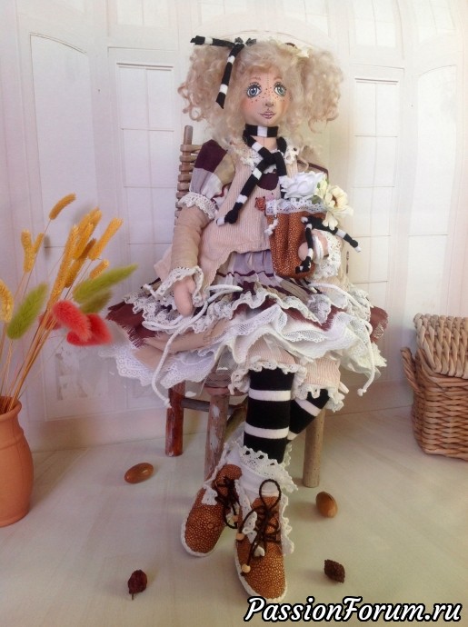 Авторская текстильная интерьерная кукла. Рост 50 см. В ручках проволочный каркас. Куколка сама не стоит, очень красиво сидит. Волосы натуральные кудри овцы.