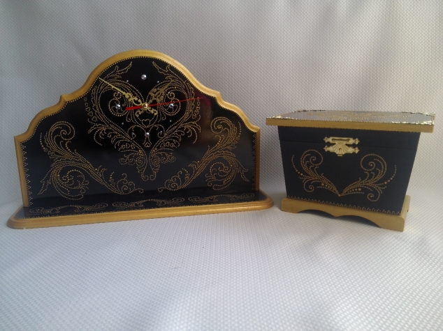 Достались мне очень дешево штук 10 заготовок шкатулок. Решила тренироваться на них)) и очень захотелось к каждой сделать что нибудь в пару, что бы не было им (шкатулкам) скучно)) Первая пара - точечная роспись. Назвала набор "Хранители времени")) Как всегда, на фото видны меленькие "цилюлитики")) на черном фоне - в жизни смотришься, как в зеркало. Пока делала фото намучилась - везде видно отображение фотоаппарата)) Потом взяла планшет и дело пошло веселее))