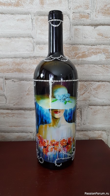 Приветствую всех мастериц и гостей моего топика ! Сегодня вашему вниманию 2-х литровая бутылочка, тёмного стекла. Хотела сделать на ней точечную роспись, но попалась мне в журнале фотография одной дамы, которая очень мне понравилась. Я распечатала фото глянцевое с этой дамой и назвала её " Незнакомкой ". Фото приклеила на ПВА. Украсила стразами . Минимум работы , но бутылочка мне самой понравилась. Ну, а дальше фотосессия. Хотолось порадовать эту Незнакомку -да...