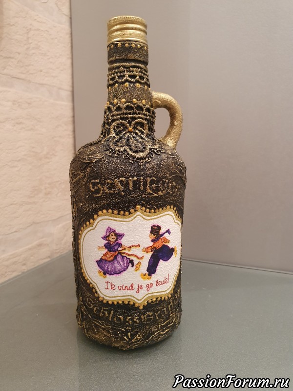 Здравствуйте , подружки-форумчанки ! Привет и всем другим, заглянувшим ко мне ! Вы про меня не забыли ? Декупаж не отпускает , вот сотворила бутылочку. Для поднятия настроения... Здесь всё просто - сами видите. Кружево, мятая бумага, салфетка, контуры, краска акриловая чёрная и золотая, клей ПВА. Спасибо всем, кто заглянул ко мне и не забыл про меня. Буду напоминать ! Всем здоровья и благополучия ! Не смотря ни на что - не падайте духом ! Берегите друг друга...