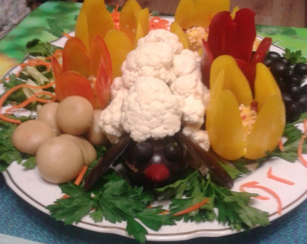 Овечка из цветной капусты Настоящим украшением праздного ужина станет эта симпатичная овечка из овощей, которую можно разместить на подносе с цветами или поставить на стол в качестве забавного дополнения к блюду с салатом. Вам потребуется: баклажан, кочан цветной капусты, оливки и перец. 1.Срежьте с баклажана полоску, чтобы придать ему устойчивость. 2.Цветную капусту разделите на соцветия и при помощи зубочисток прикрепите к баклажану, имитируя завитки шерсти. 3. Оливки и вырезанный в форме носа кусо...