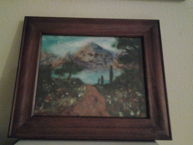 акварельное валяние и мокрое валяние. Увидела одину ссылку на картину, которую будут рисовать на мастер-классе маслом. Пейзаж очень миленький и тут во мне " загорелось ". Села и сделала. Вот результат.