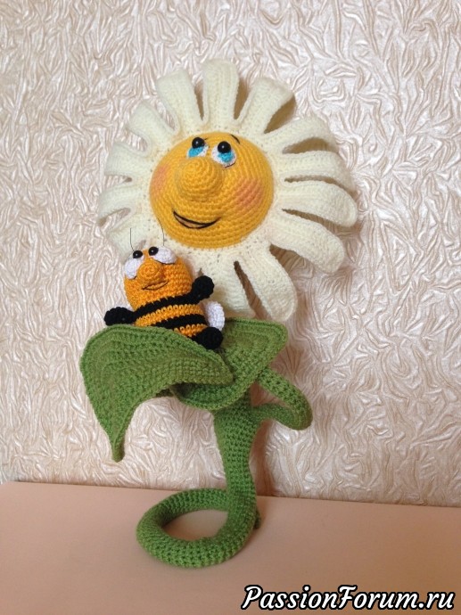 Здравствуйте, дорогие форумчанки! Расцвел у меня ещё один необычный цветок. Веселая ромашка у которой есть маленький , но очень упитанный друг- пчёл. Назвать это толстенькое создание пчелкой язык не поворачивается. Но любовь зла полюбишь ... что связалось. Автор описания этой необычной парочки Марина Борисова.