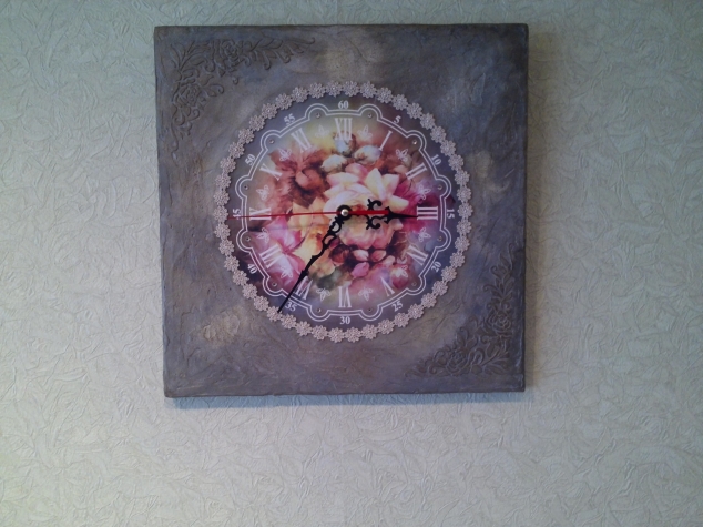Мои первые работы. Добрый день!Это мой дебют, Добрый день!Это мой дебют, очень долго наблюдаю за вашими работами, но как то не решалась выставить свои "художества",Очень хочется услышать критику и советы настоящих мастериц, т.к. я еще только учусь декупажу. А все началось со стола, уж очень хотелось его обновить, а потом в ход пошли бутылочки ( теперь все друзья и соседи собирают их ) и часы ,в комплект к столу и вазочке