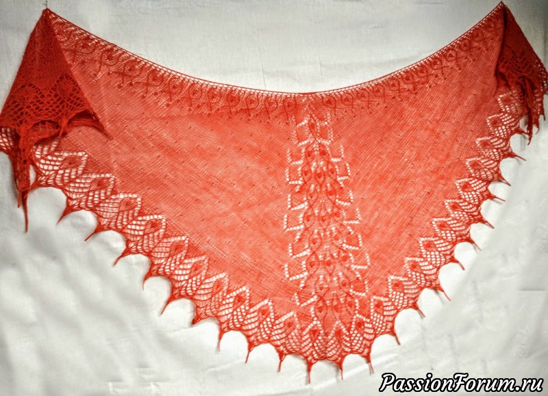 Добрый день! Закончила тестирование шали "Перо волшебной птицы" дизайнера Аллы Борисовой в ее группе в ВК. Мне она увиделась в оранжево-огненном цвете, поэтому и выбрала соответствующую пряжу. Несколько дней у нас солнышко было, а как только мне понадобилось сфотографировать шаль для отчета - снег с дождем пошел. Но отчет откладывать нельзя, поэтому фотографии получились не очень.