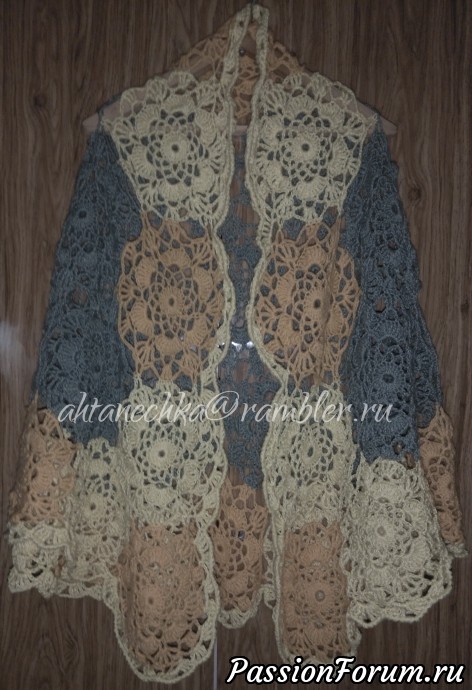 На днях закончила вязать шаль из шерсти (так же побывавшей в изделиях) крючком из круглых мотивов. Эти мотивы я неоднократно использовала для вязаных накидок разных фасонов, но для себя ничего их такого узора не было. При желании её можно использовать и как занавеску на окно (шутка).