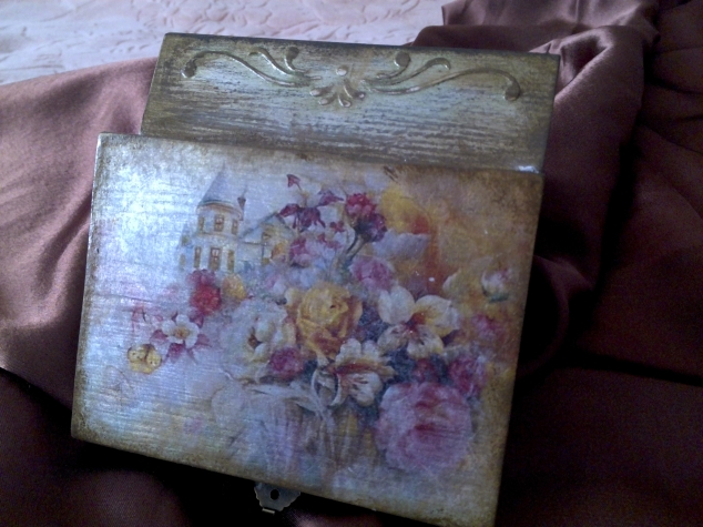 Короб-шкатулочку сделала недавно - подарок подруге на день рождения... Подруга любит зелёный цвет. Поэтому такая вот салфеточка...а так как это короб,то первый раз попробовала набрызг для состаривания... далее - оборотная сторона наружного короба внутренний ящик со съёмной подложкой.. и оборотная сторона выдвижного ящичка - первый раз попробовала лессировку... Критика и советы приветствуетс...