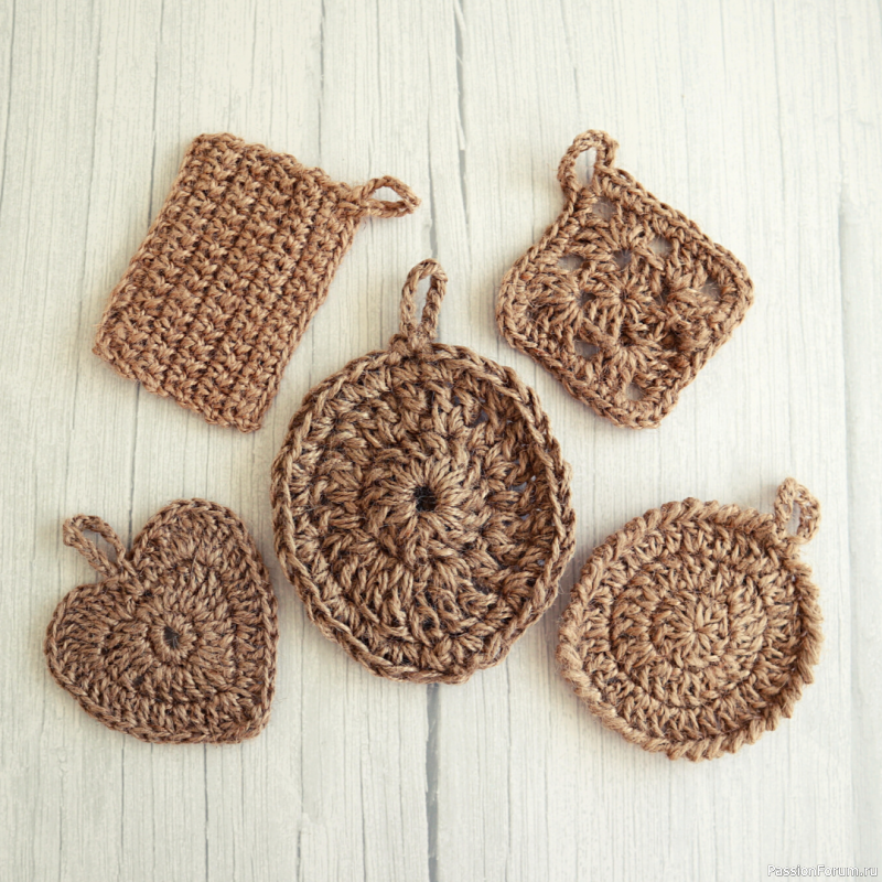 Мочалочки из джута - отличный и полезный подарок на все случаи жизни. Можно придать им разные формы в зависимости от праздника. Например, на Пасху - в форме яйца, на Новый год - в форме ёлочки и т.п.