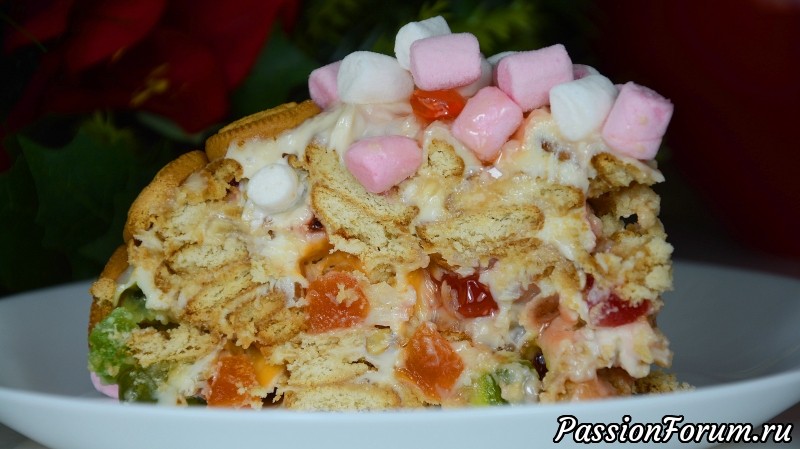 Торт без выпечки из печенья и сметаны, с грецкими орехами, цукатами и мармеладом - это просто взрыв вкуса. А вкрапления мармелада и цукатов создают яркий калейдоскоп и тортик смотрится очень аппетитно. Это отличная палочка-выручалочка к любому поводу! ИНГРЕДИЕНТЫ 300 гр. мелкого печенья 550 гр. сметаны 0,5 ст. молока (если жирная сметана) 190 гр. сгущенки 70 гр. грецких орехов 70 гр. мармелада 70 гр. цукатов для украшения: печенье маршмеллоу ПОШАГОВЫЙ РЕЦЕПТ ПРИГОТОВЛЕНИЯ ...