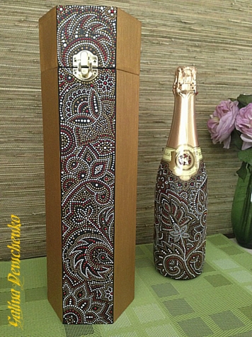 Ну вот, всем кому обещала - мой первый "точечный" мастер-класс. Начну с описания объекта декорирования. Для тех, кто видел мой предыдущий топик, он покажется очень знакомым:) В общем, расписывать будем короб для бутылки шампанского, которую я расписала ранее. Сам короб был загрунтован, зашкурен и покрыт золотой краской, кроме одной грани, выкрашенной в черный цвет. Ее и будем "точковать". Для росписи я использовала контуры по стеклу и керамике фирмы Decola: белый, золотой, бронз...