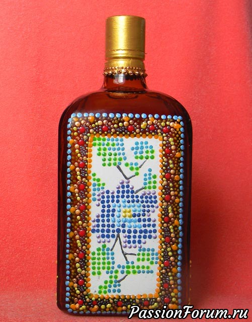 Вот такая получилась "зачпоканая" бутылочка. Жалко было выбросить, - вот и на ней и тренировалась точки контуром ставить. )))